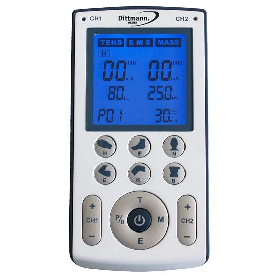 Mit dem Dittmann Health Tensgerät „TEN 250“ lassen sich Schmerzbereiche natürlich behandeln. Mit Hilfe von Klebeelektroden fließen elektrische Impulse in das Nervensystem und die Muskulatur. Der Strom gelangt von der positiven Elektrode zur negativen und stimuliert so Nerven und Muskeln – dadurch wird die Schmerzzuleitung zum Gehirn beeinflusst und das Schmerzempfinden kann vermindert werden.